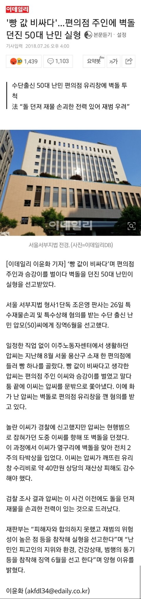 빵값 비싸다고 편의점에 돌 던진 "압"모씨