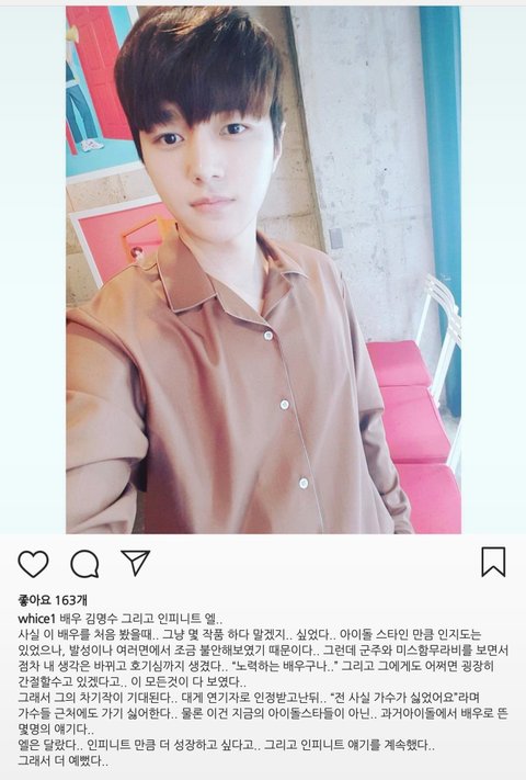 기자님 인스타에 올라온 글이라는데 우리명수 너무 예쁘다 난 솔직히 멤버들 배우 활동하고 연기하는 거 너무 좋고 뿌듯한데 배우활동 하는 와중에도 본인이 인피니트라는 걸 잊지 않고 활동해 준다는 게 넘 고마워 ㅠㅠ