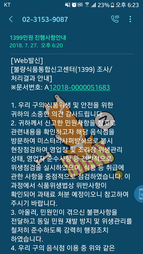 + 한가지 알려드리자면 식약처에 식품위생법 관련 신고는 1399번 전화하셔서 상담원분께 신고 접수 바로 할 수 있어요! 인터넷으로 하는것보다 빠른 것 같아요. 저와 비슷한 상황이 생기시면 1399로 빠르게 신고하셔요ㅎㅎ