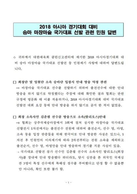 체육회로부터 답변을 받고, 며칠뒤 대한승마협회 홍모 상소위원으로부터 자신의 명예를 훼손시켰다는 명목으로 저를 고소 하겠다며 연락을 받았습니다.