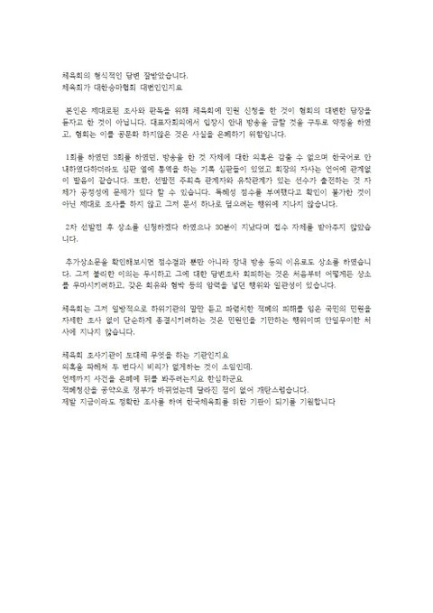 체육회의 답신에 대한 저의 회신입니다.