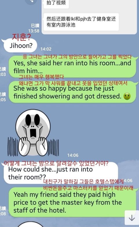 사생이 호텔한테 돈 주고 애들 방 마스터키 받아서 룸 안에서 사진 찍은 거야 애초에 마스터키 주면 안 되냐 큰 돈 준 사생이나 그 돈 받고 마스터키 판 호텔이나 똑같지만 이 지경 까지 왔는데 아무런 대처도 없고 피드백도 없는 소속사나 다 똑같지 이거 말고도 타멤 목격짤이랍시고 맨날 똑같은 계정에서 올라오는 사진 있었어 걔도 사생이었지 이것도 이번 년도는 맞는데 사진 찾기가 힘들어서 오늘 알게 된 사진들만 올렸어