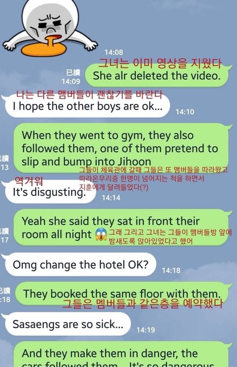 뭐 소속사 직원이 워너원 사생 홈이랑 연락해서 비행기 정보 알려준 적도 있고 그 사생 홈이 옆에 앉은 멤버한테 자리 바꿔주면 안 되냐 말 까지 하면서 비행기 좌석 옆자리도 앉으려 했었어 그 때 포털사이트 트위터 등 총공 했는데 소속사가 못 올라가게 다 막아서 모르는 사람들 많을 지도 몰라 결국 마지막에 총공 하기 10분 전에 총공 문구 바꿔서 실트 올라가긴 했지만 피드백도 올라오긴 했는데 다 개소리고 내가 한 줄로 요약하자면 우리 직원 건드리면 고소할거야 !! ㅇㅇ 이거야