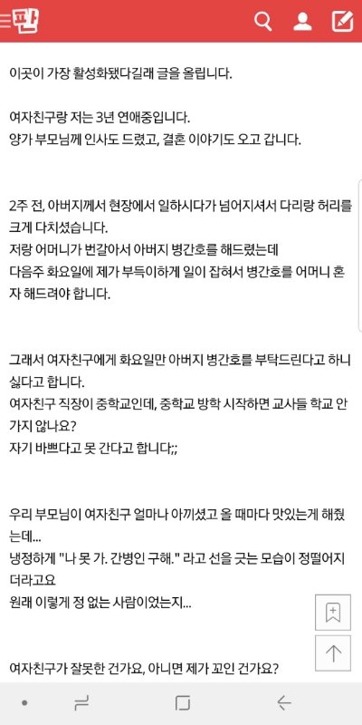 대 놓고 대리 간병을 요구하고 그 부모란 사람도 여친한테 간병 받고 싶다 대 놓고 말하는 인성이라니...