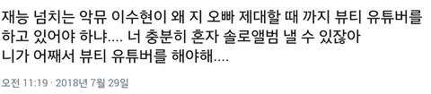 일부 사람들이 '오빠 찬혁이가 군대가서 혼자 남겨진 수현이는 뷰티유튜버 활동이나 하고있고 음악이나 방송활동에 제약이 있다?' 라고 말하고 있음.. 이런말 하면서 군대간 찬혁이는 동생앞길막는 오빠로 욕먹고 있고 수현이는 수동적이고 불쌍하게 보는거.. 진짜 팬들이나 수현이나 찬혁이 다들 억울해ㅠㅠ