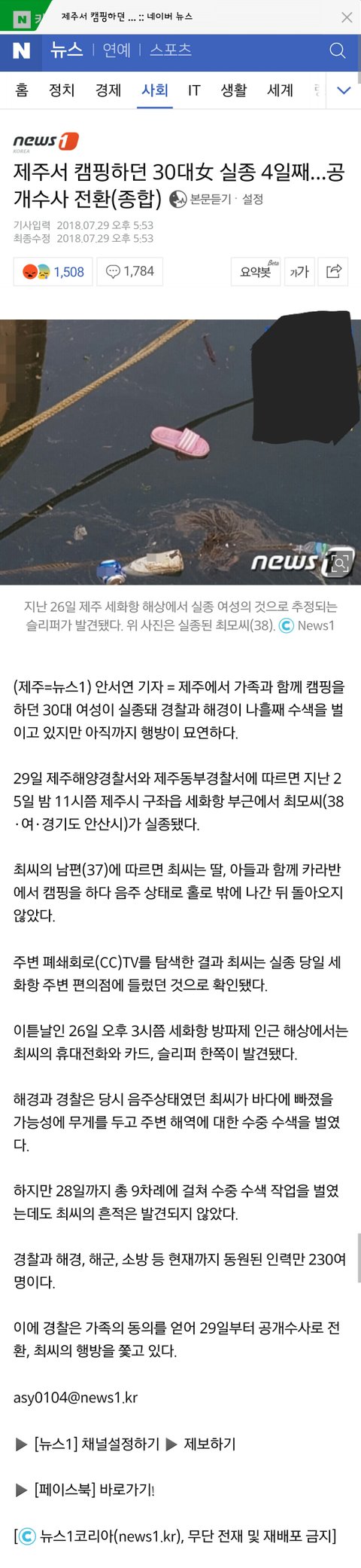 갔다가 현재까지 실종된상태입니다. 휴대폰과 슬리퍼,카드는 바다에서 발견되었다는데 여성분은 아직 못찾았어요ㅠ
