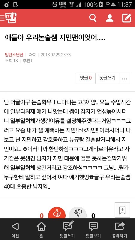 문제시 글삭할게 조회수 높이지 말라구.. 베톡갈까봐 그랬고 지민이 이야기라기보다 논술샘 이야기 같아서 기분 상하진 말았음 해!