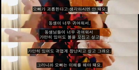 애초에 정신제대로 박힌 오빠를 기준으로 얘기하주는거잖아ㅋㅋㅋㅋ 오빠가 동생이 귀여워서 둘이 투닥거리는게 기준이지 오빠가 일방적으로 동생을 패고 때리는게 기준이냐?ㅋㅋㅋㅋ 도대체 어느정도의 수위를 상상하는거야ㅋㅋㅋㅋ니들은 동생 괴롭힐때 걔가 정말 경멸스러워서 죽도록 패세요?ㅋㅋㅋ뭔 말도안되는 논란에 선동질이여.. 애초에 순수한'오빠'의 입장에서 자기는 그렇다라고 얘기해준거지 동생을 ㄹㅇ진심으로 때리는 오빠들은 해당되는게 아니에요~^^