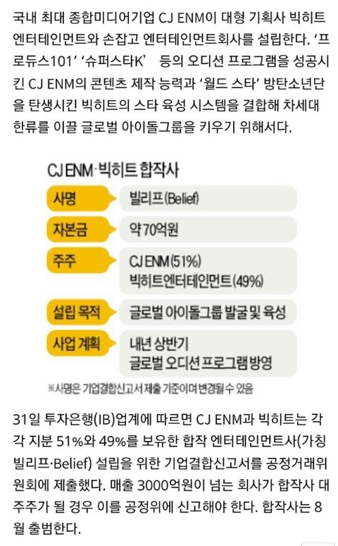 CJ랑 빅히트랑 합작사 세운데..!! 무슨 오디션 프로그램 같은것도 하나봐..대박이다 진짜