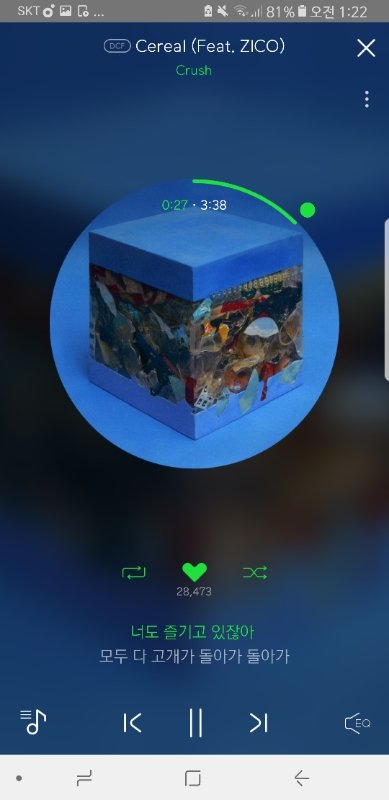 크러쉬와 지코의 만남,, 크,, 그냥 믿고 듣는거지 뭐ㅠㅠ 이 노래 도입 부분 비트가 좋아서 맨날 앞부분 당겨서 계속 듣고 그래ㅋㅋㅋㅋㅋ 가사도 엄청 귀여워. 씨리얼이라고 그래놀라 라는 가사 나오고ㅋㅋㅋㅋ 아무튼 듣다보면 귀여워서 웃겨. 지코 랩도 딱 내 스타일 ㅎㅎㅎㅎ