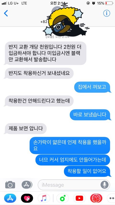 그러더니 입금하세요 라길래 계좌번호 알려주세요라고 보낸순간 뒷말에... 그냥 해드릴테니까요.... 하... 그냥 해드릴테니까요래요 글쎄... 그냥 선심쓰듯이 해주겠다는 느낌이 들더라구요. 기분이 더더더더 나빠졌어요. 근데 이부분에선 꾹 참았어요. 화내면 교환해줄때 이상한 제품을 보낼까봐서요(소심)... 그래서 확인차 2천원 맞냐고 물었죠... 근데 답변이 달갑지 않게 왔어요. 이해해요. 저쪽도 기분나쁘겠지요. 제가 거짓말하고 있다고 생각하고 있을테니까요. 근데 그 다음이 진짜 가관이에요...
