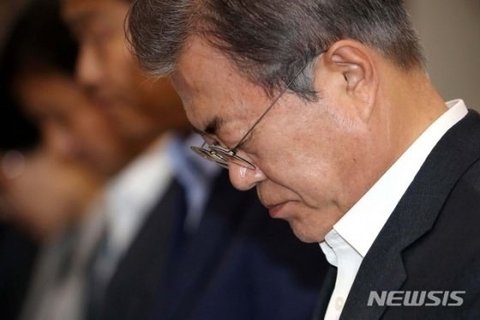 (사진 설명) 【서울=뉴시스】박진희 기자 = 문재인 대통령이 23일 청와대 여민관에서 열린 수석·보좌관 회의에 앞서 '마린온' 헬기 추락사고 순직장병을 위해 묵념을 하고 있다. 2018.07.23. pak7130@newsis.com