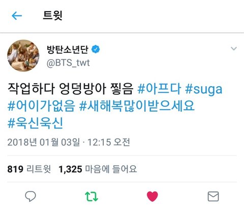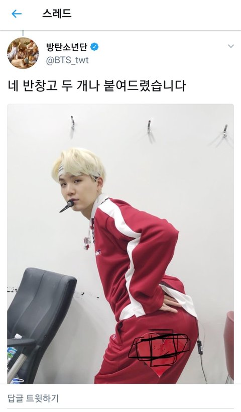 i❤️에서 리트윗하고ㅋㅋㅋ 윤기 엉덩이 아프다니까 신의 가호가 있길 빈다고ㅋㅋㅋ
