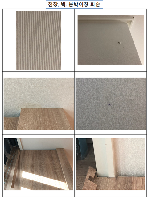 벽지파손 및 장판 파손에 대해 컴플레인을 제기하지 않았습니다.