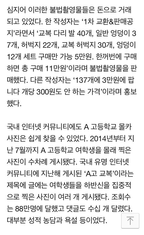 신체부위별로 가격도 정해서 판매하려고했다고함 기숙사 몰카도 그렇고 이번 여고생 몰카도 그것이알고싶다 웹하드 업로드 장의사커넥션도 전부 충격적인데 별로 논란안되고 기사도 별로없네 기숙사 몰카는 가해자 잡혔는지 후속기사도 없고 5월에 터진사건인데 그리고 여고생몰카는 4년동안 있었는데 이제알려진것도 소름인것같아