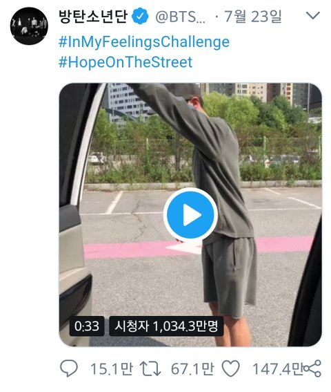 제이홉 트윗에 첼린지 올렸음 천만 넘음ㅎㄷㄷ 웬만한