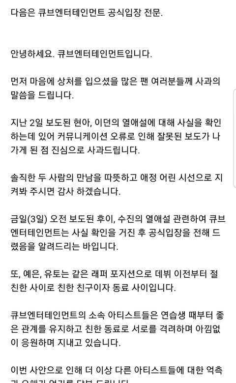 큐브 공식입장 떴네