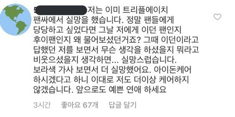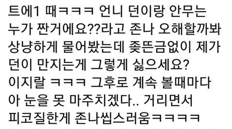 팬서비스같은거 하나 감당 못할거면 남돌이랑 왜사겨.. 그게 개네 직업이고 일인데.. 회사에서 갓 데뷔하면 여친, 남친 구도 만드는게 왜 그렇게 하는거겠음.. 유사연애 먹는 사람들이 생각보다 많고, 돈이 되니까 그러는거지.. 이던이 팬서비스 한다고 째려보고, 본문 내용이 사실인지 아닌지는 모르겠지만 사실이라고 가정했을 때 저런 가벼운 질문 하나 제대로 답 못하는건.. 프로답지 못한거 아니냐.. 아이돌을 몇년을 했는데 그런거 하나 못받아침..? 알아야 할건 여기는 할리우드랑 다르다는거..