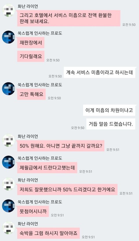 → 이것은 서비스 미흡의 차원이 아니며, 일주일치 전액도 아니고 3일치 환불해달라는 건데 왜 50%밖에 못 해주냐고 따짐. → 우길 걸 우겨라, 말이 안 통한다며 진상 취급 시전.