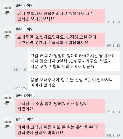 → 변호사에게 자문을 구한 결과 보통 100%는 힘들고 합의를 보는 것이 가장 좋다, 인터넷에 고발하겠다는 식으로 이야기해보라는 조언을 듣고 결국 50% 받고 끝내겠다고 함. → 환불 받은 판례가 있으면 가져와봐라. 거짓말 한 거 아니냐. 솔직하게 인정하면 주겠다라며 선심 쓰듯이 이야기를 함. 50% 받고 끝내겠다 하지 않았냐, 그렇게 떳떳하시면 인터넷에 고발하겠다 라고 하자 계좌번호를 알려달라며 3일치 50%를 환불해줌.