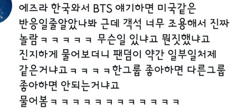 에즈라 미국에서 본 열광적인 반응을 생각하고 한국 반응 궁금해서 물어본 거 같은데 물어봤던 거 같은데 코믹콘이 팬층이랄지, 파는 분야랄지 좀.. 달라서.. 미국에서 케이팝 팬하면 보통 특정 가수 팬이라기보단 케이팝 장르 두루두루 파는 잡팬 경향인데, 아미는 케이팝팬이 아니라 bts팬이라서 미국내 케이팝 팬덤에서도 특이취급받는 걸로 알고 있음(그래서 더 미국엔터 내에서 화제가 되는 거, 그렇게 충성도 높고 헌신적인 팬덤이 드믈어서)