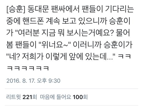 5. 팬싸에서 팬들이 다 트위터로 위너 프리뷰 보고있으니까 뭐보냐고 궁금해서 물어봤는데 위너 본다니까 어이없어함