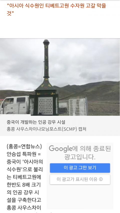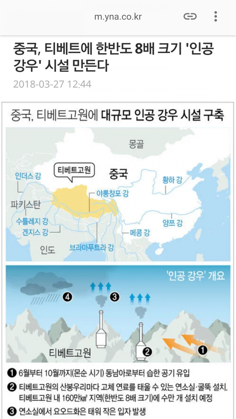 1. 몇년 전부터 중국이 티벳 고원 수자원 고갈을 막는다며 비행기로 요오드화 은을 뿌려댐