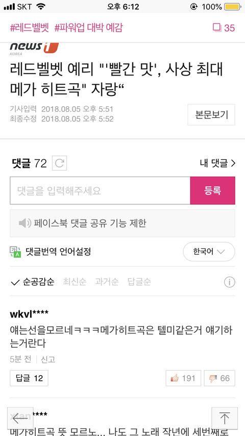 예리가 우리 레드벨벳 곡중에서 제일 최대히트친 노래라고 소개한걸 기자년이 저런식으로 제목붙인거임 좀 알고 나불거려