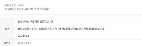 봄날에 이어서 디엔에이까지 1억 스밍 달성한 거 축하해 차트인 1억스밍 2곡 보유하는 남돌은 방탄이 최초라며