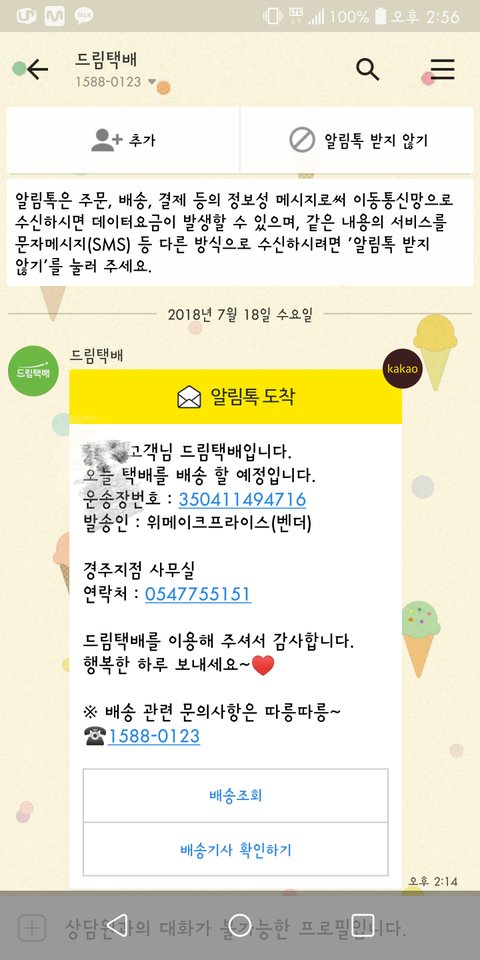 하지만 7월 18일에 이렇게 다른 배송사에서 경주에 도착했다는 카톡이 왔고, 2일 정도 기다렸으나 배송되지 않아서 배송업체로 전화했습니다.