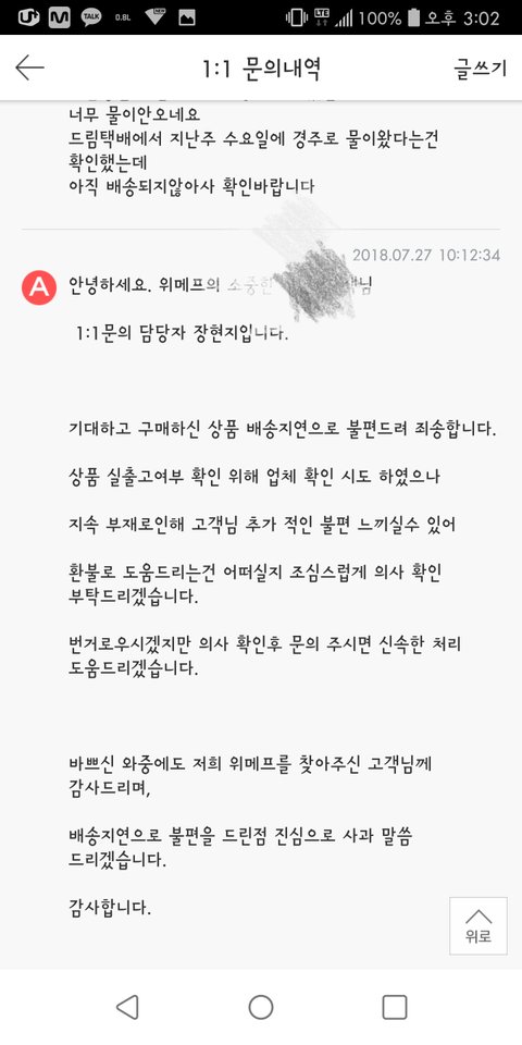전화로 따지고 따져서 환불은 오늘일자로 받았습니다.