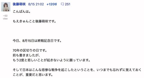 일본이 이런 비참한 전쟁을 일으켰다는 사실을... 언제나 잊지 말고 기억해 두는 것이, 중요하다고 생각합니다 -고토 모에-