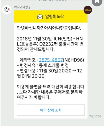 오늘 11월 30일 인천-호놀룰루 oz232편 출발시간이 변경되었다고 문자옴
