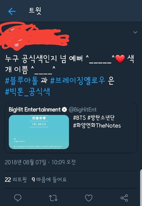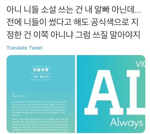 트윗에서 빅톤 팬들이 방탄이 원래 화양연화 떡밥 같은거 숨겨논 소설 멤버별로 컴백전에 몇개 올려주는게 있거든? 근데 빅톤팬이 이번에 올라온 방탄 진 소설에 배경으로 쓰인 색이 빅톤 공식색이라면서 방탄이 표절했다고 ㅈㄴ 빡빡우기면서 비꼼ㅋㅋㅋㅋ 근데 현실은 빅톤 데뷔도 하기 6개월전에 방탄 화양연화 앨범에 쓰인 색이고 심지어 빅톤 공식색은 데뷔하고나서 1년뒤에 정한거임ㅋㅋㅋㅋ 색은 겹칠수도 있는거고 아무런 트집 잡을 생각도 없었고 따지자면 빅톤이 표절한건데 되려 방탄한테 뭐라그러길래 웃기고 어이없어서 올려봄ㅋㅋㅋ(심지어 과거 빅톤 방탄 화양연화 컨셉 포토도 따라한 전적이 있음..) 아미들이 다 반박했는데 빅톤팬들 왈 아무리 니들이 먼저 썼어도 우리가 그 후에 공식색으로 지정했으니까 너네가 쓰면 안되는것이다 이지랄중..