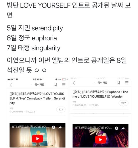 ㅋㅋㅋㅋㅋ이삐 지금알았어? 저 궁예 매우 많이 돌아다녔어ㅋㅋㅋㅋ 유툽에 올라온 날짜로는 4,5,6일이라 석진이 컴트 7일인 오늘이라고 궁예한 이삐도 있었고 유포리아는 컴트가 아니니까 제외하고 유툽날짜로 짐니 태형이 컴트가 4,6일이라 8일이라고 궁예한글도 있었고ㅋㅋㅋ