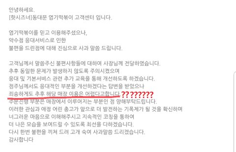응대 불만 문의 남겼더니 저 한줄 꼭 끼워서 답변하는 엽기떡볶이 본사도 참 대단하네요