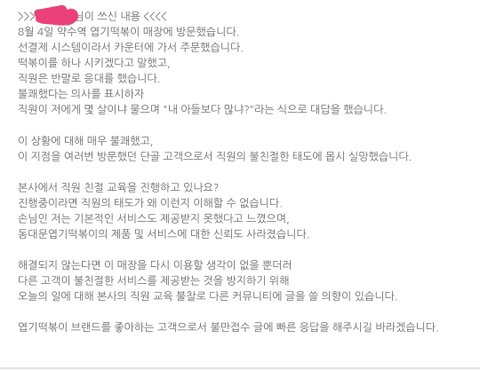 떡볶이라는 음식 특성상 매장에 여성 고객이 많을텐데 이렇게 대우 하는것도 웃기고요