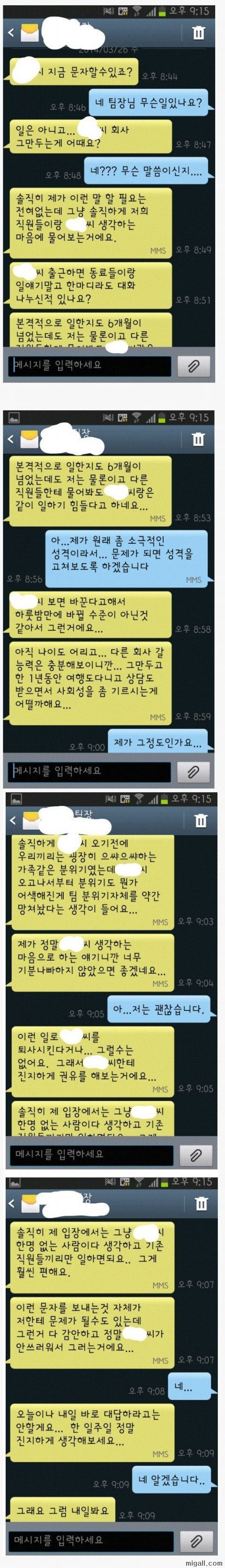 ㅋㅋㅋ회사에서 도대체 자기일만 잘해내고 업무적 커뮤니케이션만 제대로하면 되지ㅋㅋㅋ무슨 가족같은 분위기좀 그만찾아라 저런걸로 퇴사권유하는게 웃기네