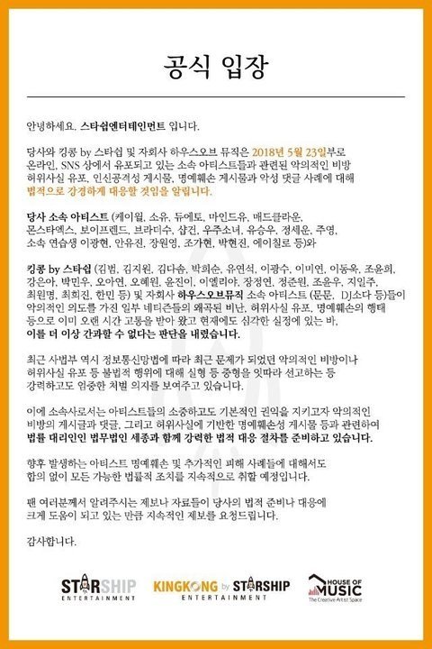 장원영 허위사실 유포에 대한 스타쉽 대응