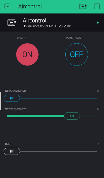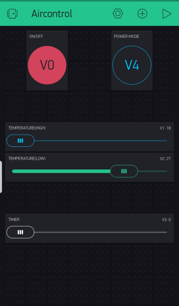 전원 버튼, 파워냉방 버튼, 풍량 센거(18-30도), 풍량 작게(18-30도), 타이머 이렇게 만들었다