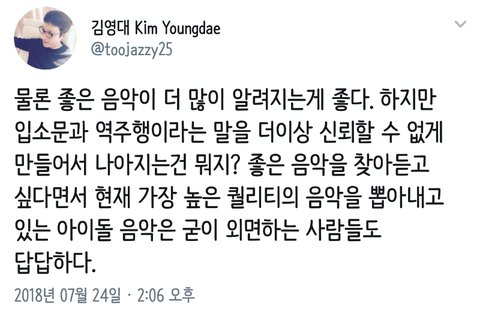 아이돌노래가 저평가받지않고 하나의 장르로 이해해줬으면 좋겠다. 발라드라고 모두가 눈물흘리면서 듣는것도아니고 힙합이라고 모두가 흥얼거리는것도아닌데