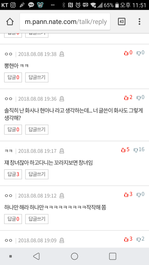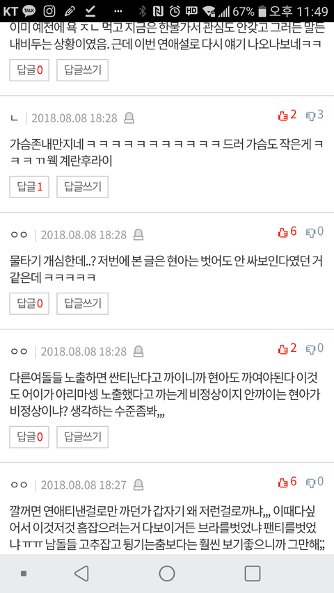 남친하나 생겼다고 ㅆㅌ난다 ㅊx다 노출증있다 ㅇㅈㄹ ㅋㅋㅋㅋㅋㅋ 아니 현아가 지금 잘못한건맞는데 물타기 너무 심하고 니네 성희롱 아무렇지도 않게해;ㅋㅋㅋㅋㅋ욕할거면 잘못한부분만 욕하던가 뭔짓이야 이게 이러니까 판 인식안좋은거임