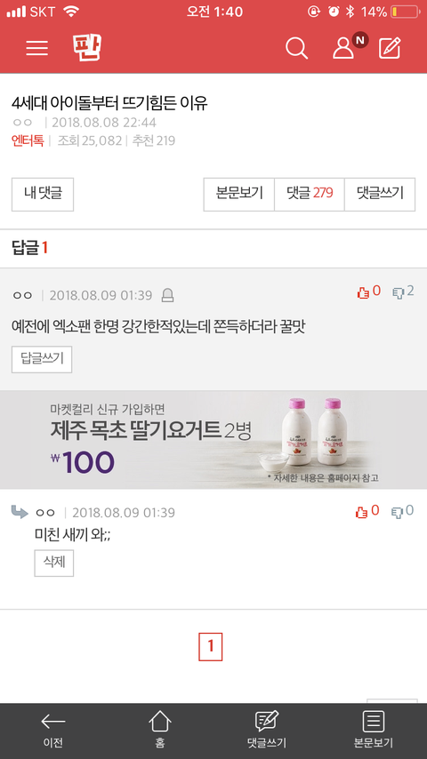 지금 판분위기 개판임 온갖 잡덕 팬덤 어그로 악플러 다 있음 대형팬덤팬들이 많다고 생각하면 오산임 현아 이던 글 댓글보면 성희롱 오짐 현아이던 욕먹을 짓 한건 맞지만 적당한 선은 지켜야 한다고 생각함 여기 펜타곤 팬들 일케 많았는지 몰랐다 엑방원팬들만 많은게 아니고 여돌팬들 잡다한 남돌팬들도 개 많은 곳이 여기고 익명이다보니 수위 조절이 안됨 판은 폐쇄시켜야 함 엔터톡도 아이돌톡ㅇ로 바뀐지 오래됨