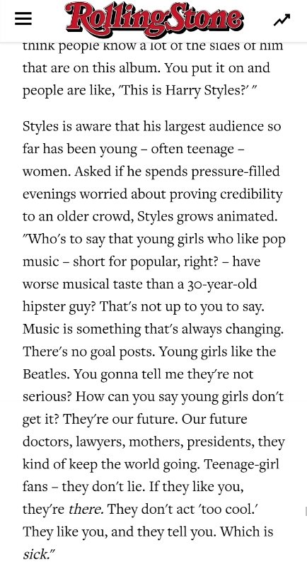 "누가 팝 음악-말하자면 대중 음악이죠-을 좋아하는 어린 소녀들의 음악 취향이 30살 힙스터 가이의 취향보다 나쁘다고 말할 수 있나요? 그건 남들이 말할 문제가 아니예요. 음악은 항상 변하는 거죠. 목표 지점은 따로 없어요. 어린 소녀들도 비틀즈를 좋아해요. 그들에게 진지하지 않은 거라고 말할 건가요? 어떻게 어린 소녀들은 이해하지 못할 거라고 말할 수 있나요? 그들은 우리의 미래예요. 우리 미래의 의사, 변호사, 어머니, 대통령이고 그들은 세계를 돌아가게 해요. 10대의 소녀팬들은 거짓말을 하지 않아요. 만약 그들이 당신을 좋아한다면 거기에 있어줄 거예요. 그들은 쿨하게 행동하려고 하지 않아요. 당신을 좋아한다는 걸 솔직하게 당신에게 말해줘요. 그게 멋진 점이죠."
