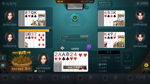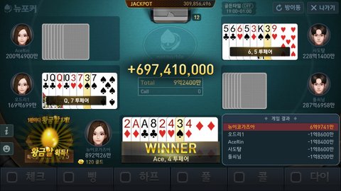 에이스,4 투페어라고해도 카드가 8장으로하는 뉴포커라서 그냥 에라 모르겠다 생각하고