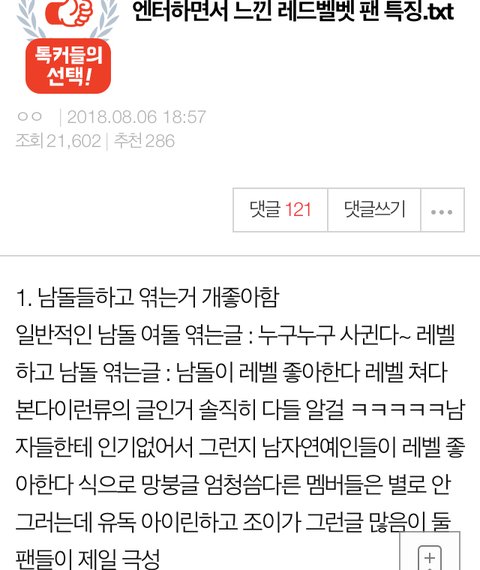 그리고 남자들한테 인기 없어서 자꾸 망붕이니 뭐니 그러는데 레드벨벳 팬들은 남덕유입 되게 싫어하는 건 알아? 진짜 혐오할 정도로 싫어하더라 아닌 분도 있겠지만.