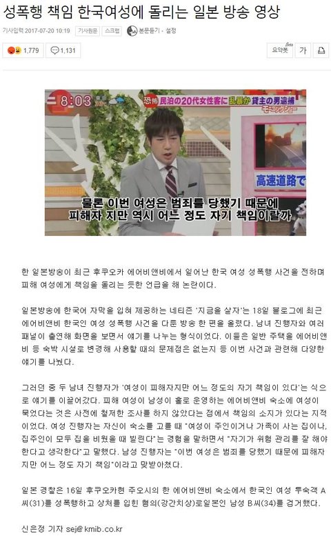 그런데 일본 지상파 방송에선 이 사건을 전하며 피해자인 한국인 여성에게도 문제가 있다는 식으로 방송을 함 ㄷㄷㄷ