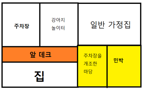 상기와 같은 구조로 저희집 앞데크와 민박의 주차장을 개조한 마당이 이어져 있었고