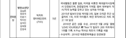 방탄소년단 문화훈장 후보 됐대