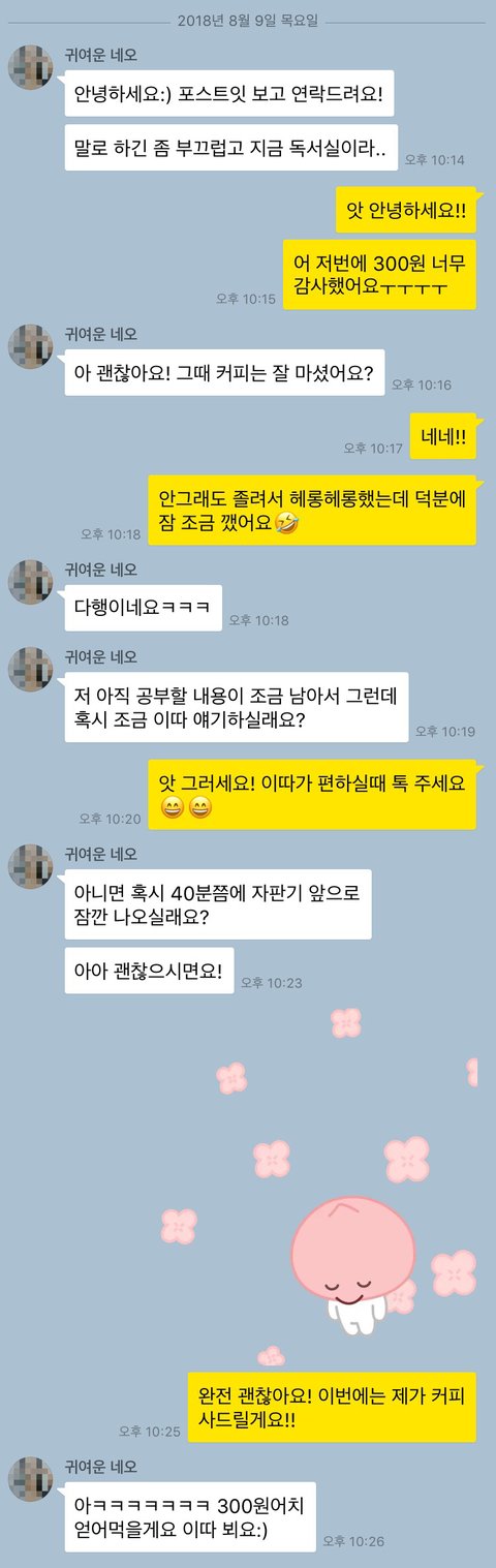 우선..... 나는 뭐 말로 하거나 쪽지를 다시 보내실줄 알고 신경 안쓰는척 무심한척 열심히 공부하고 있었어.. 사실 공부 1도 안되서 밑줄만 죽죽 긋고..ㅋㅋㅋㅋㅋㅋㅜㅜ 근데 시간 좀 지나도 쪽지 같은 거 안오길래 눈물 참고 있었는데 카톡이 왔어ㅜㅜㅜㅜㅜㅜㅜㅜㅜ 캡쳐하기로 캡했느넫 했는데 대화 내용 다 보일지 ㅁ모르겠다 진짜 너무 떨려서 옆사람들 눈치보면서 책상 구석에서 답장하고 증말....... 그와중에 할말 없고 정신 없어서 쪽지ㅣ에서 한말 또하고 감사하다고 몇번 하는지 모르겟으무ㅜㅜㅜ 나 진짜 너무 행복해 다 판녀들 덕분이야 너네가 쪽지 내용도 도와주ㅗ고 잘되라고 빌어준 덕분이야ㅜㅜㅜㅜ 사랑해 짐짜!!!!!!!ㅠㅜㅜㅜㅜㅜㅜㅜㅜ 우선 지금 급히 화장했어ㅋㅋㅋ쿠ㅜㅜ 40분 다되가네 뭐라 끝낼지 모르겠다 너무 고마워 판녀들!!!!